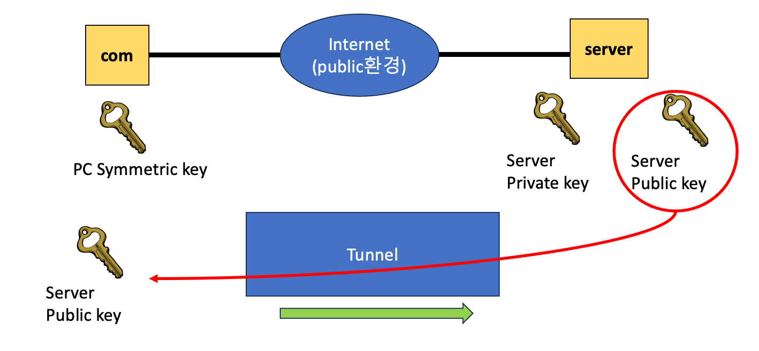 그 다음에 PC가 자신의 대칭키를 Server public key로 암호화하여 server측에 전달합니다.