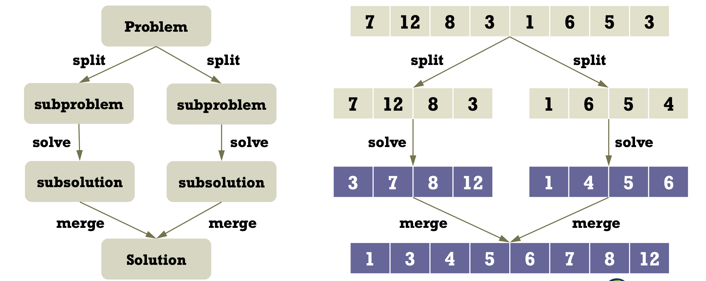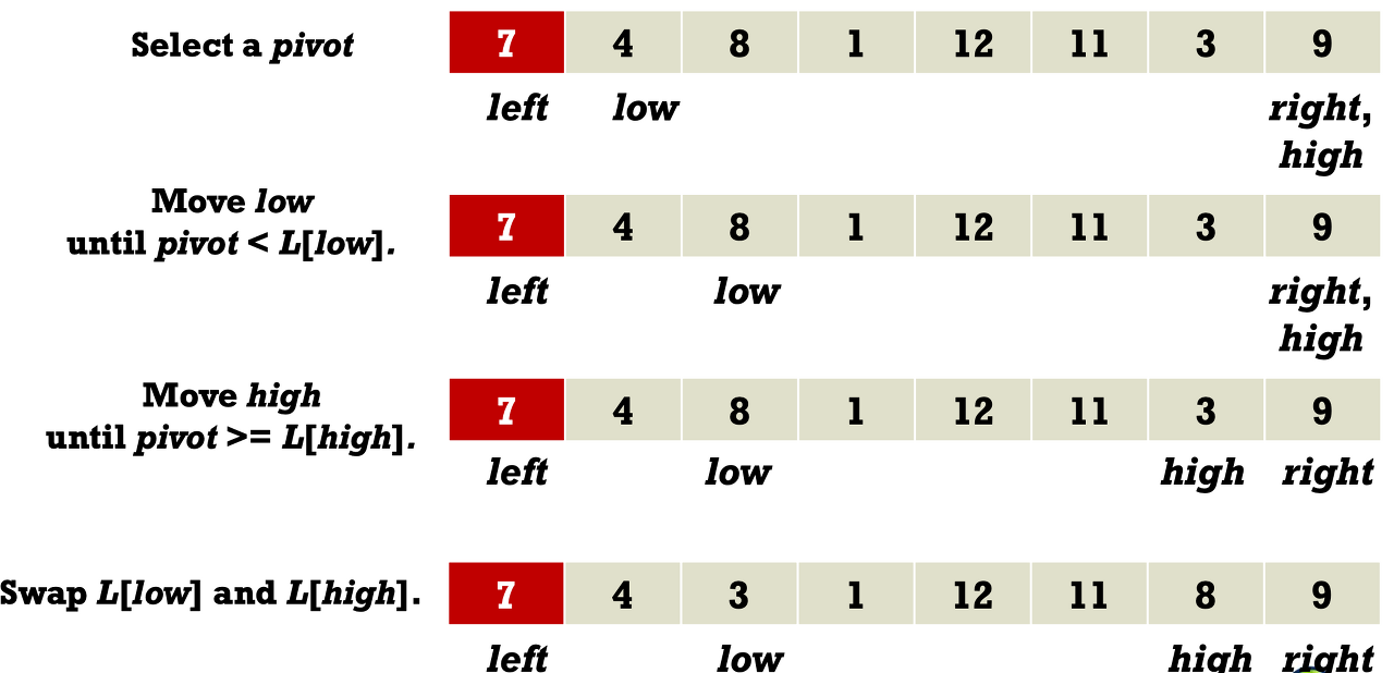 Quick Sort Based on the divide and conquer(D&C) paradigm. Overall procedure Pivot selection: Pick an element, called a pivot, from the list. ex) For each list, select a pivot as the left-most element. Partitioning: reorder the list with the pivot. The elements less than the pivot come before the pivot. The elements greater than the pivot come after the pivot. ex) Partitino the list into two subl..